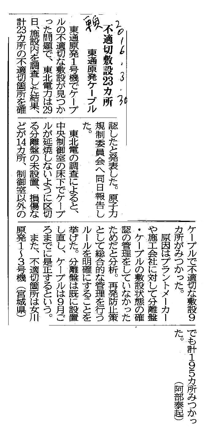| [2016_03_30_01]不適切敷設23か所 東通原発ケーブル(東奥日報2016年3月30日) |