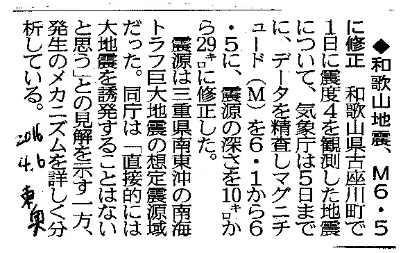 [2016_04_06_08]和歌山地震、M6.5に修正(東奥日報2016年4月6日)