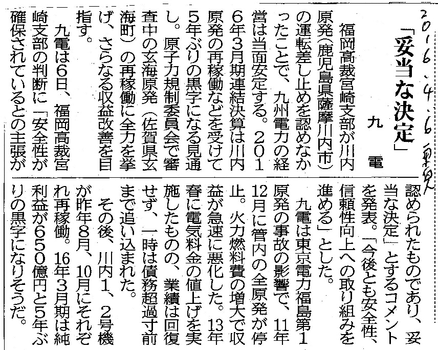 [2016_04_06_13]「妥当な決定」 九電(東奥日報2016年4月6日)
