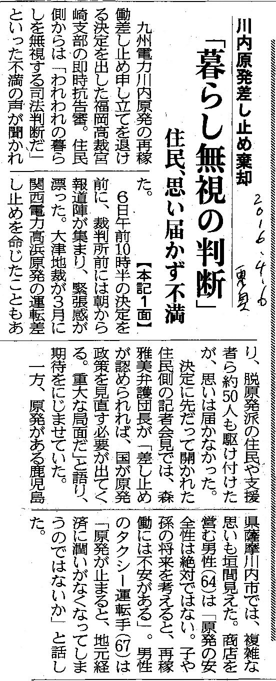 [2016_04_06_14]川内原発 差し止め棄却 「暮らし無視の判断」 住民、思い届かず不満(東奥日報2016年4月6日)