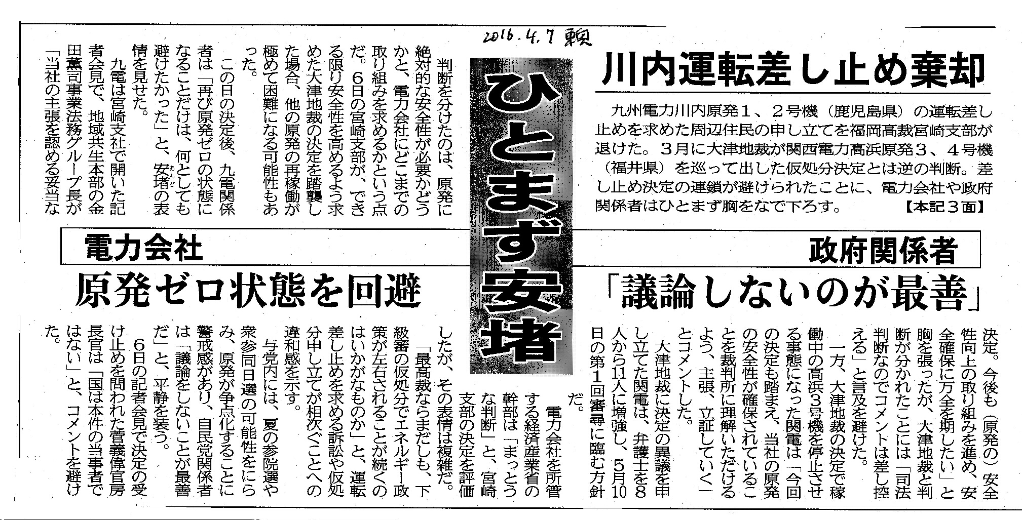 [2016_04_07_12]川内運転差し止め棄却 ひとまず安堵 電力会社 原発ゼロ状態を回避 政府関係者 「議論しないのが最善」(東奥日報2016年4月7日)