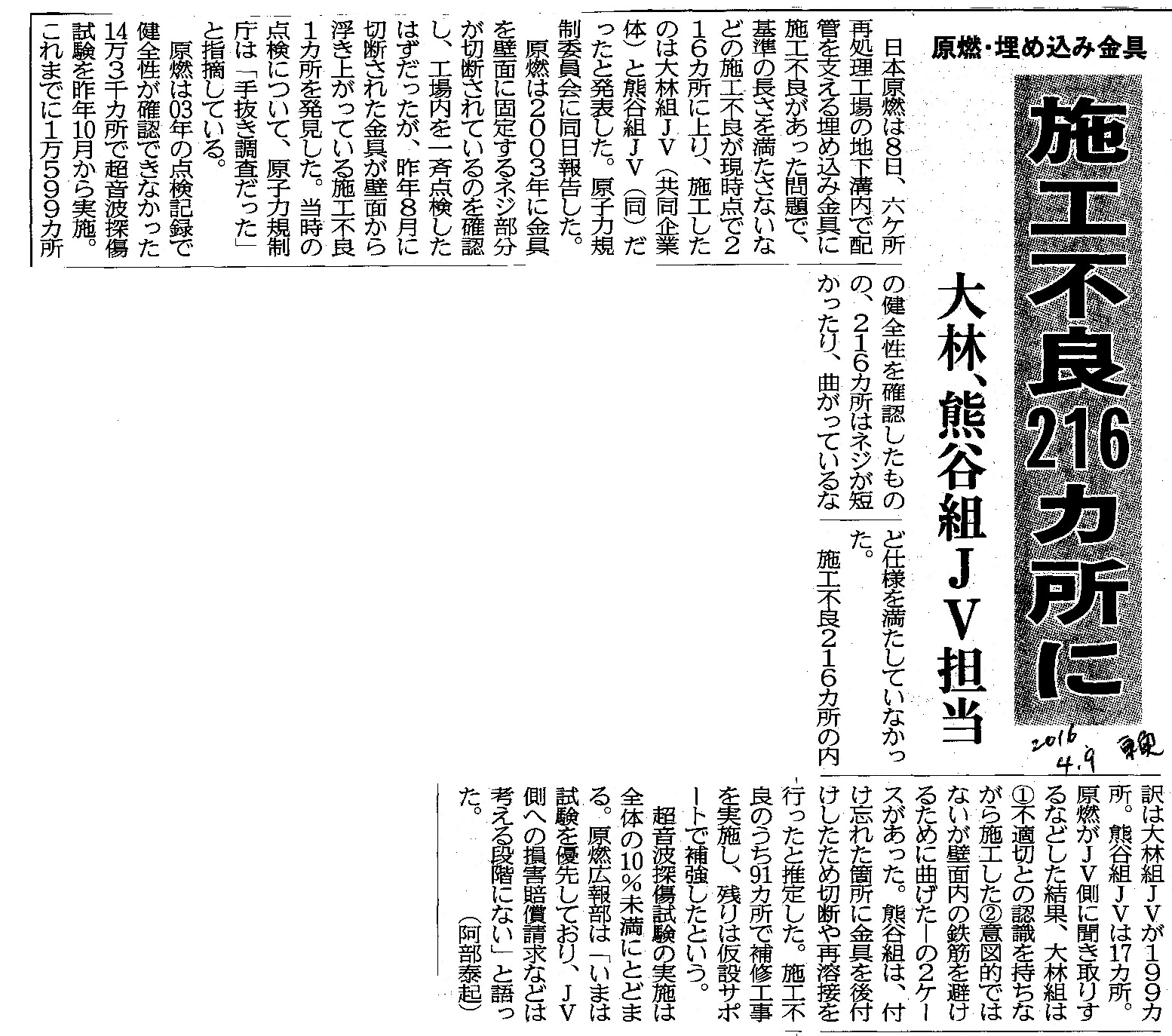 | [2016_04_09_02]原燃・埋め込み金具 施工不良216カ所に 大林、熊川組JV担当(東奥日報2016年4月9日) |