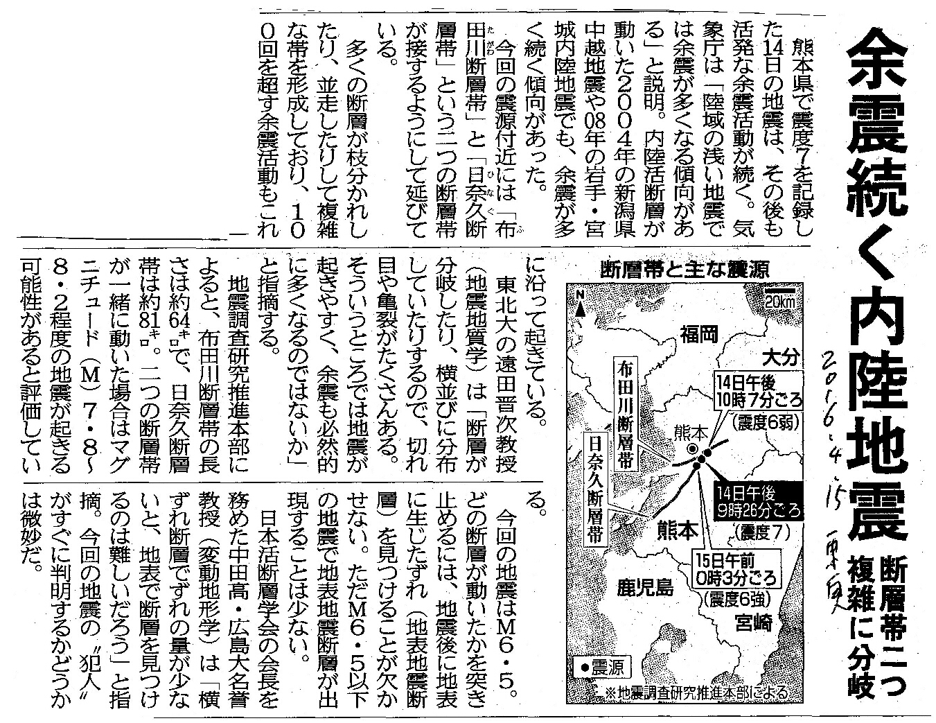 | [2016_04_15_13]余震続く内陸地震 断層帯二つ 複雑に分岐(東奥日報2016年4月15日) |
