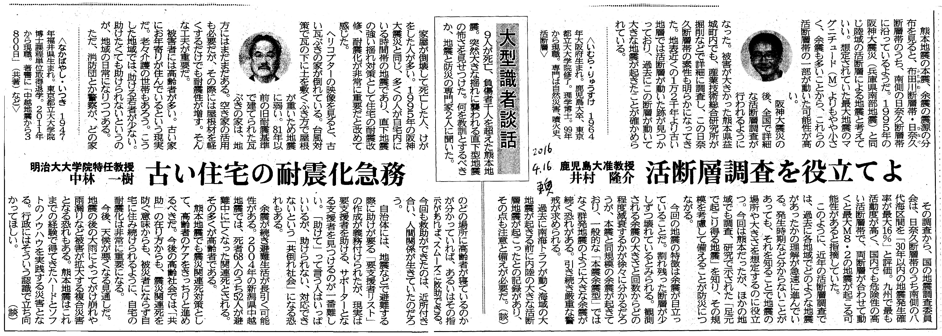 | [2016_04_16_14]大型識者談話 明治大大学院特任教授 中林一樹 古い住宅の耐震化急務 鹿児島大准教授 井村隆介 活断層調査を役立てよ(東奥日報2016年4月16日) |