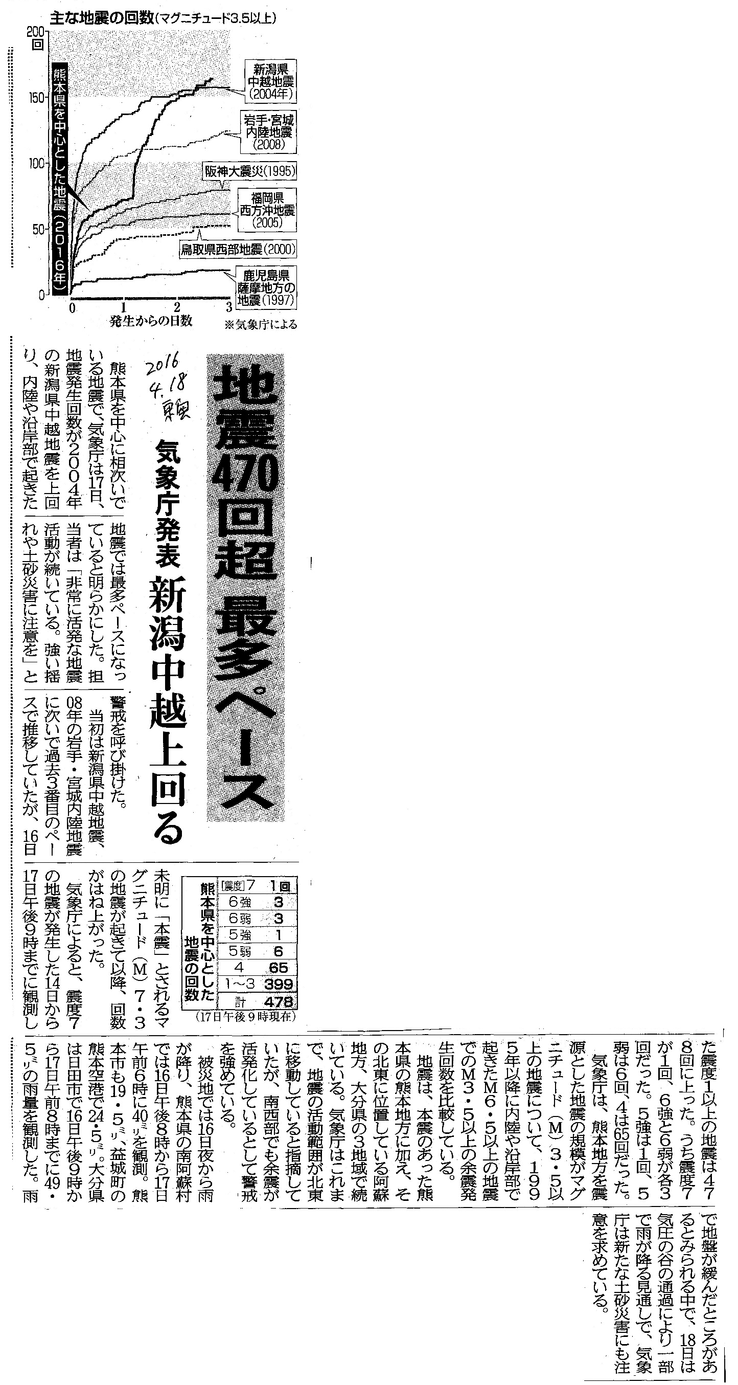 [2016_04_18_06]地震470回超 最多ペース 気象庁発表 新潟中越上回る(東奥日報2016年4月18日)