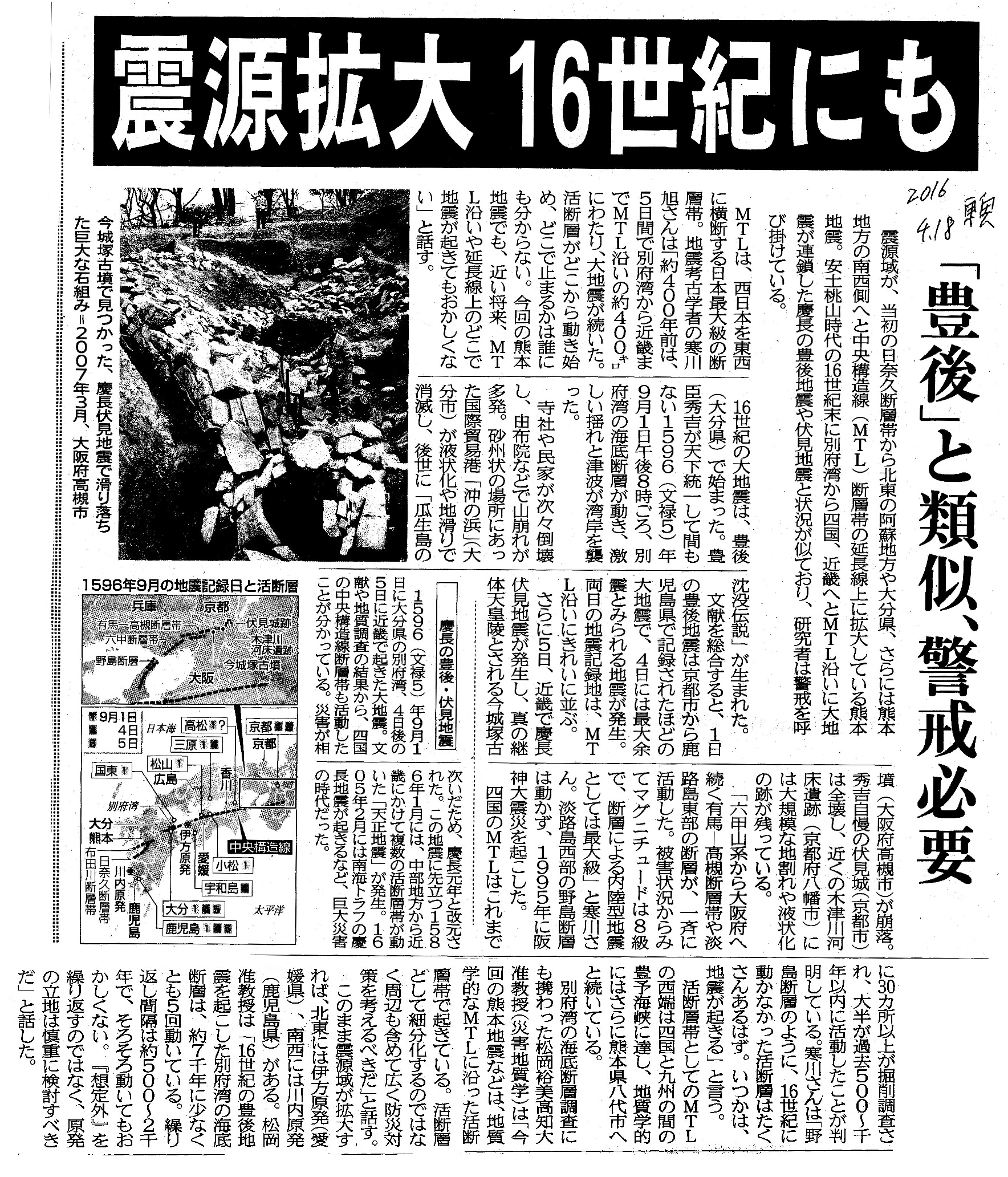 [2016_04_18_09]震源拡大 16世紀にも 「豊後」と類似、警戒必要(東奥日報2016年4月18日)