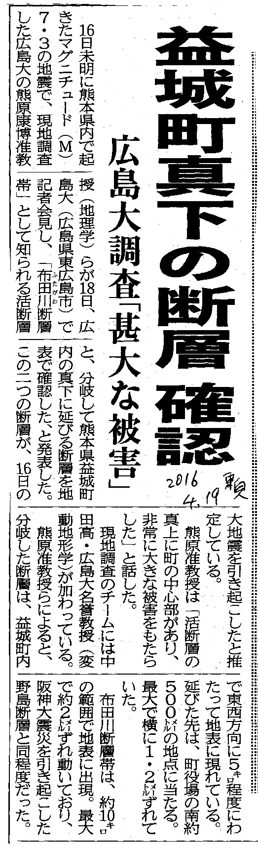 [2016_04_19_02]益城町真下の断層 確認 広島大調査 「甚大な被害」(東奥日報2016年4月19日)