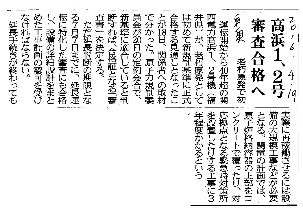 [2016_04_19_06]高浜1,2号 審査合格へ 老朽原発で初(東奥日報2016年4月19日)