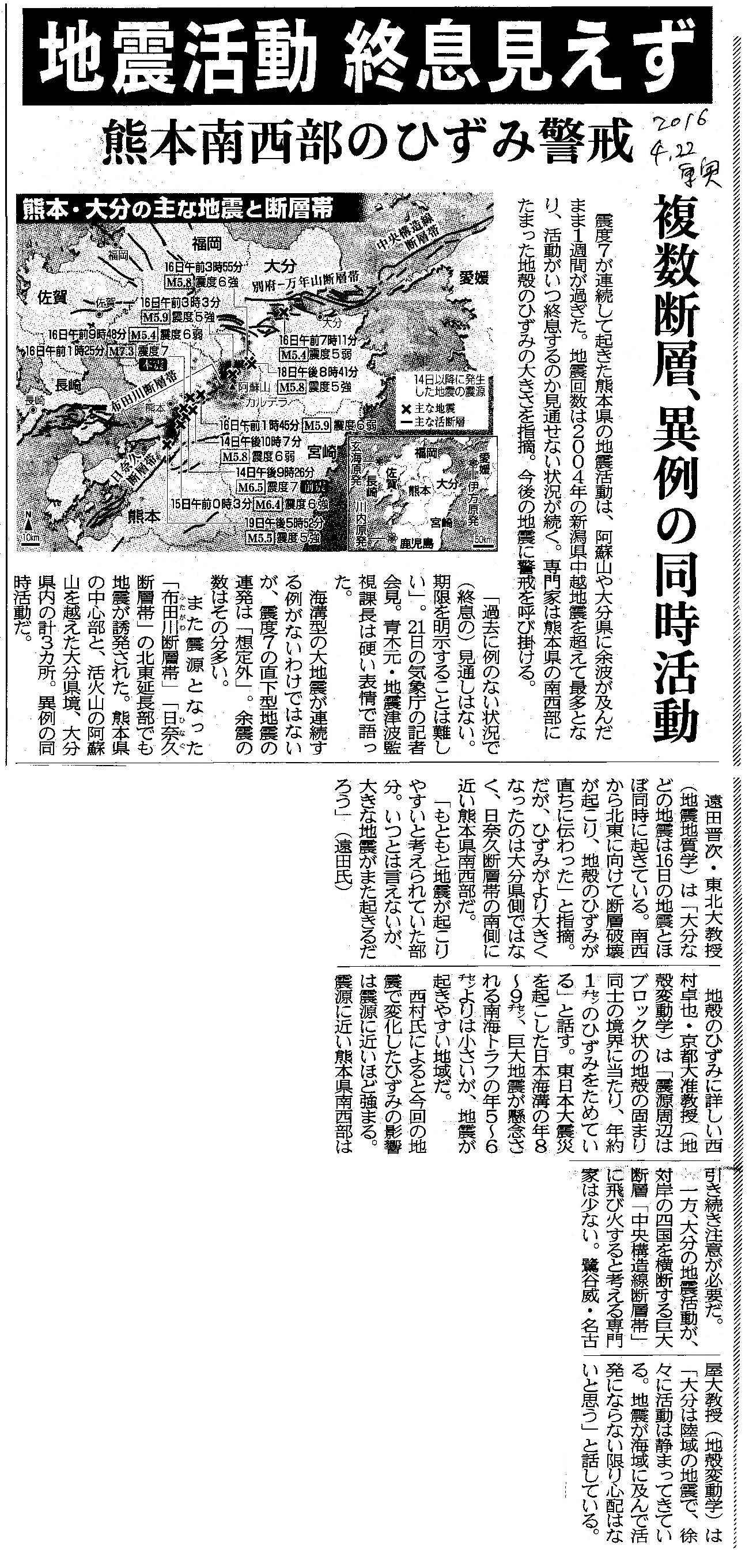 [2016_04_22_01]地震活動 終息見えず 熊本南西部のひずみ警戒 複数断層、異例の同時活動(東奥日報2016年4月22日)