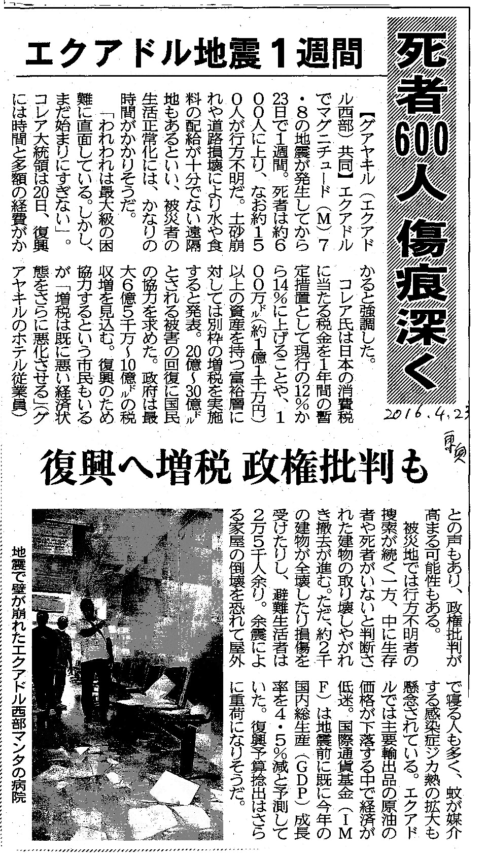 [2016_04_23_04]エクアドル地震一週間 死者600人 傷痕深く 復興へ増税 政権批判も(東奥日報2016年4月23日)