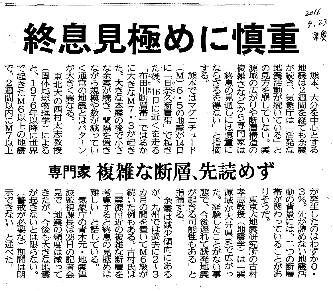 [2016_04_23_07]終息見極めに慎重 専門家 複雑な断層、先読めず(東奥日報2016年4月23日)
