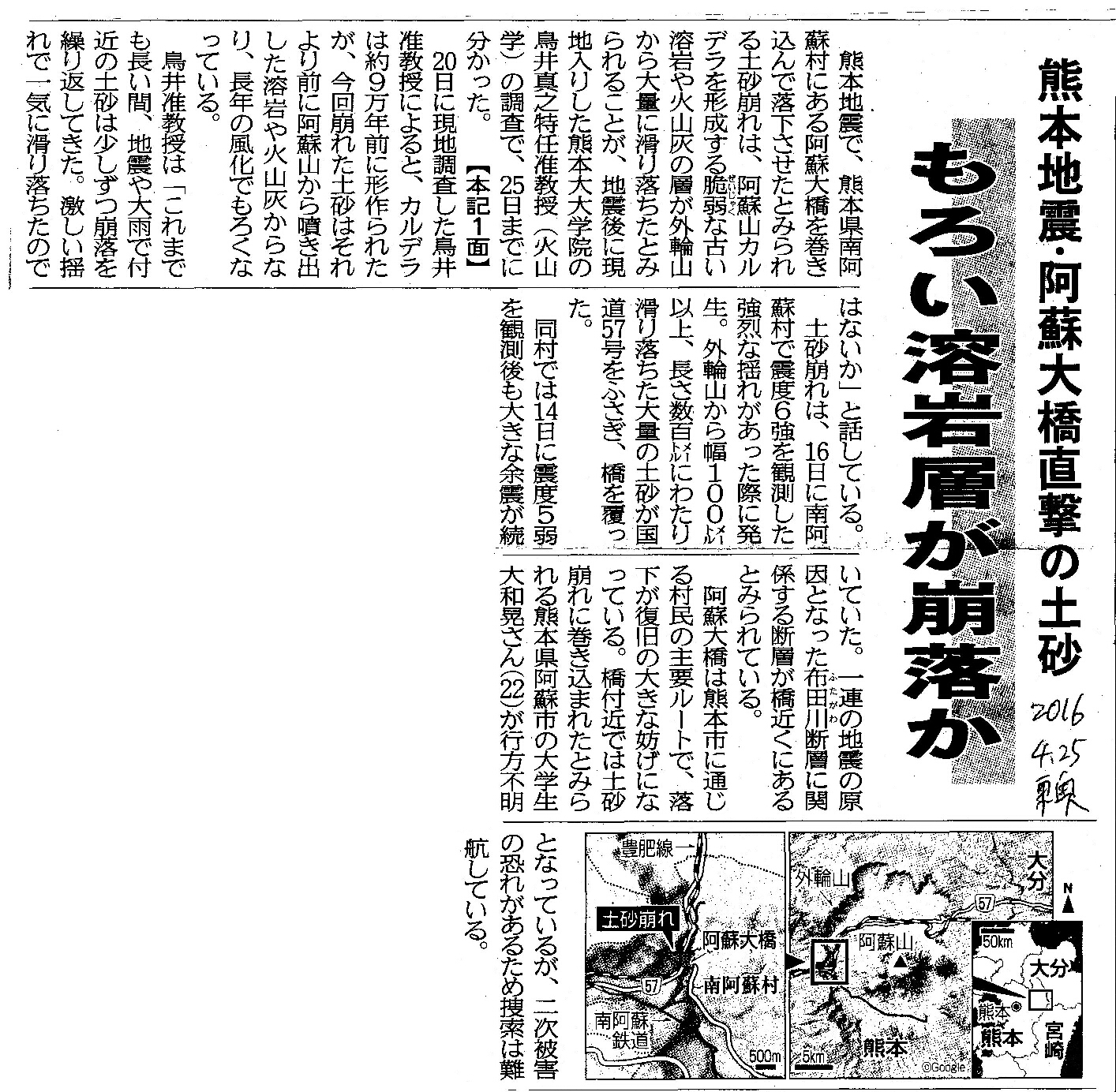 [2016_04_25_02]熊本地震・阿蘇大橋直撃の土砂 もろい溶岩層が崩落か(東奥日報2016年4月25日)