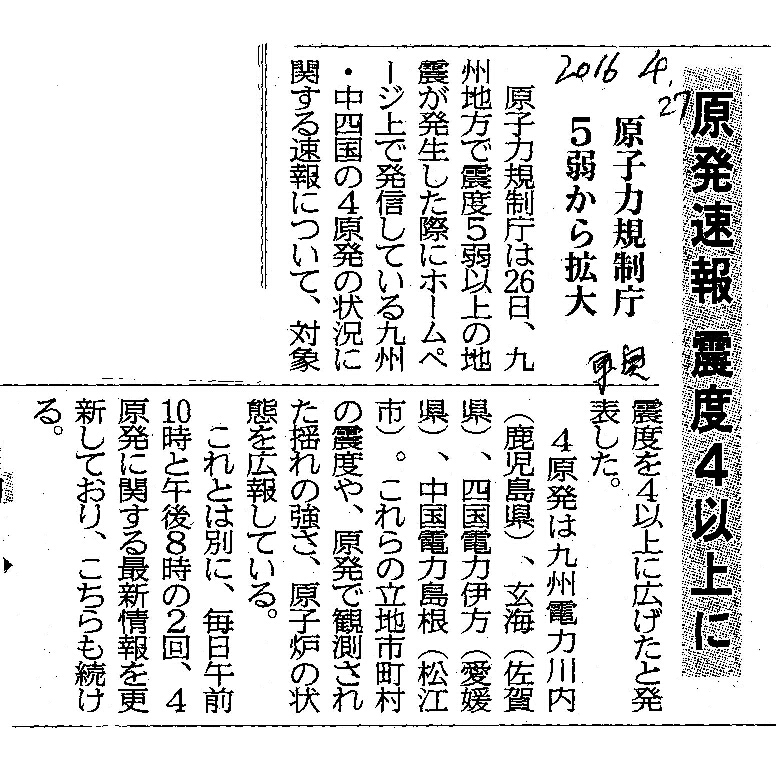 [2016_04_27_03]原発速報 震度4以上に 原子力規制庁 5弱から拡大(東奥日報2016年4月27日)