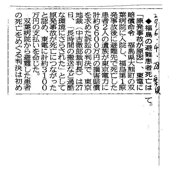 [2016_04_28_04]福島の避難患者死亡は「原発事故が原因」、東電に賠償命令(東奥日報2016年4月28日)