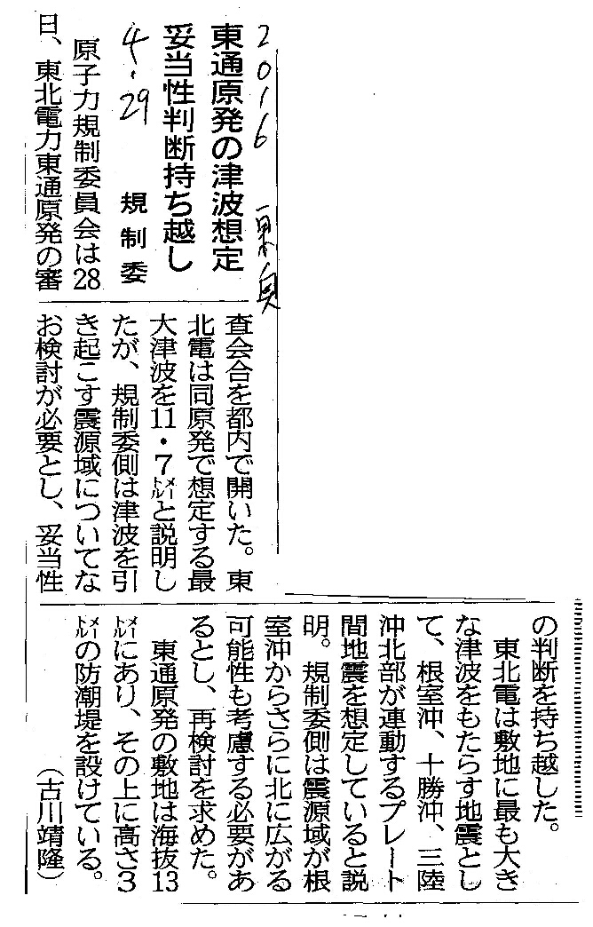 | [2016_04_29_01]東通原発の津波想定 妥当性判断持ち越し 規制委(東奥日報2016年4月29日) |
