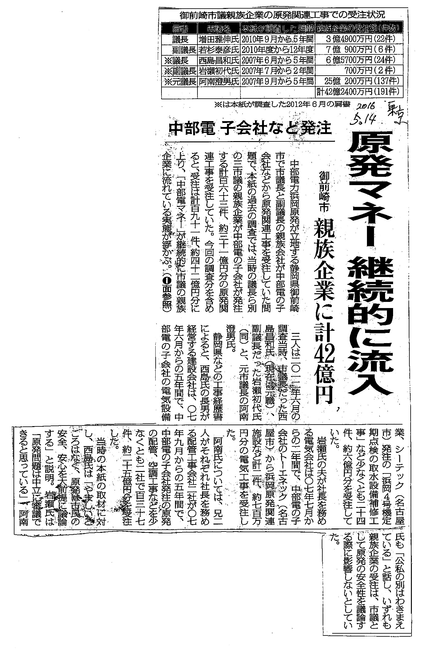 [2016_05_14_02]原発マネー 継続的に流入 御前崎市 親族企業に計42億円 中部電 子会社などに発注(東京新聞2016年5月14日)