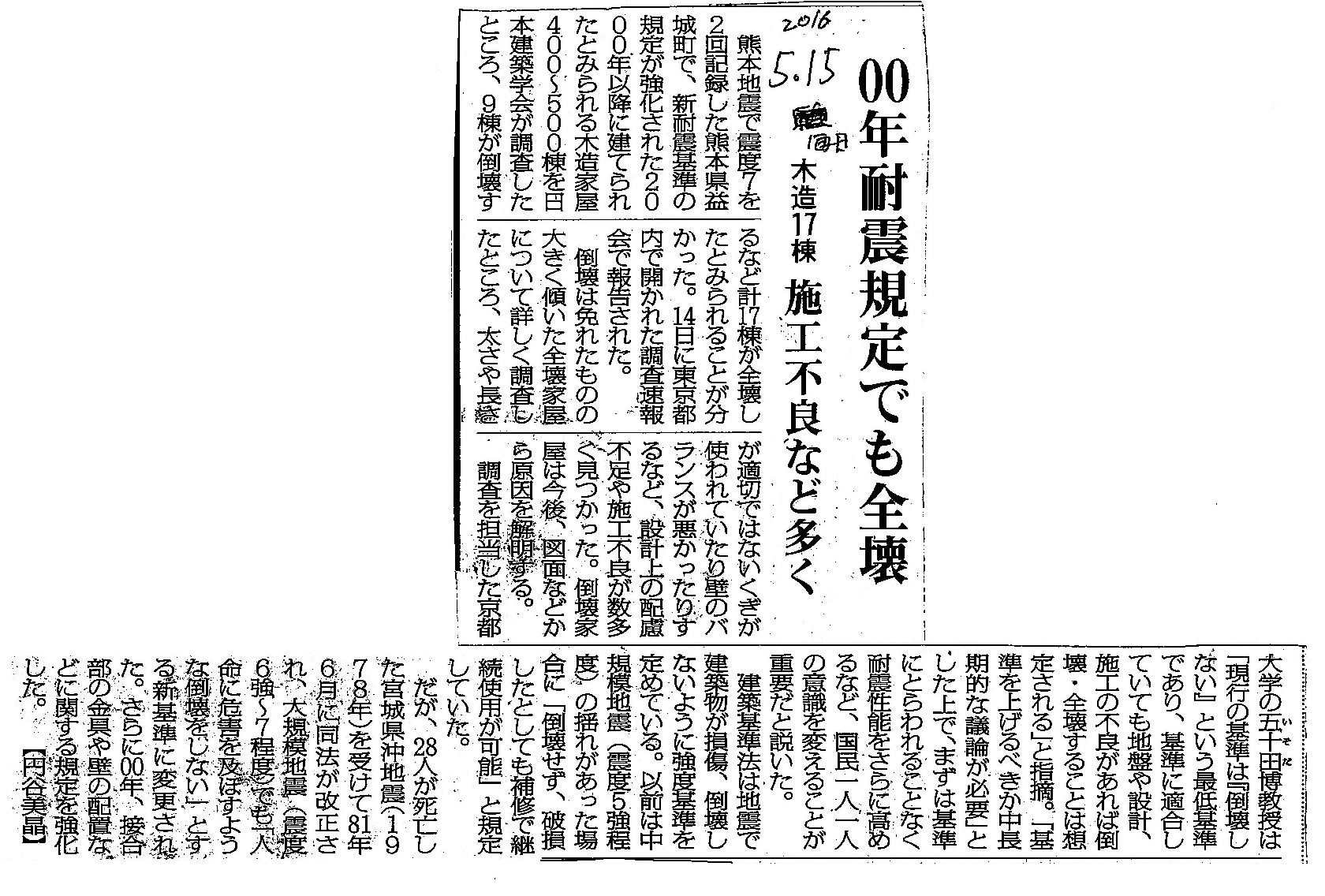 [2016_05_15_01]00年耐震規定でも全壊 木造17棟 施工不良など多く(毎日新聞2016年5月15日)