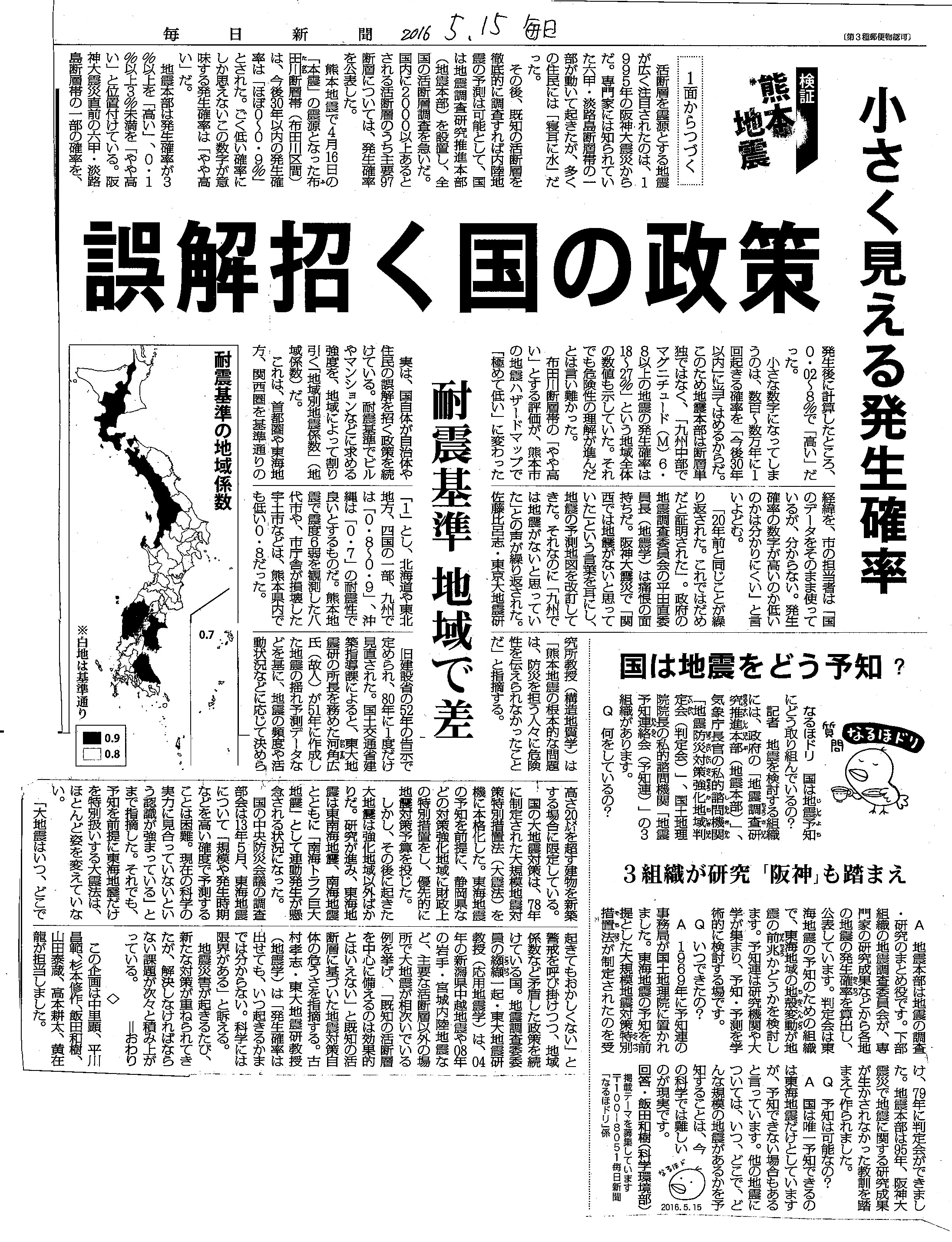 | [2016_05_15_03]検証 熊本地震 小さく見える発生確率 誤解招く国の政策 耐震基準 地域で差 国は地震をどう予知? 3組織が研究「阪神」も踏まえ(毎日新聞2016年5月15日) |
