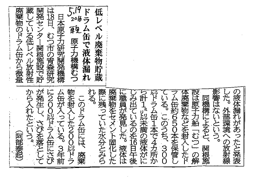 [2016_05_19_03]低レベル廃棄物貯蔵ドラム缶で液体漏れ 原子力機構むつ(東奥日報2016年5月19日)