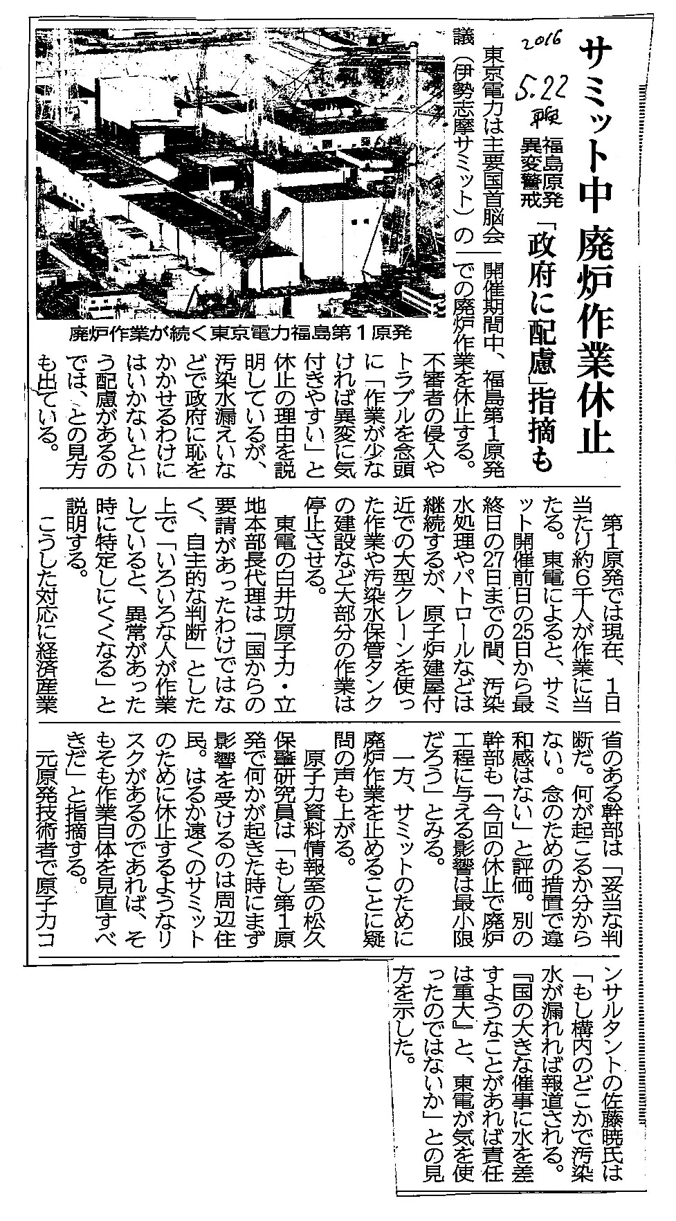 [2016_05_22_05]サミット中 廃炉作業中止 福島原発異変警戒 「政府に配慮」指摘も(東奥日報2016年5月22日)