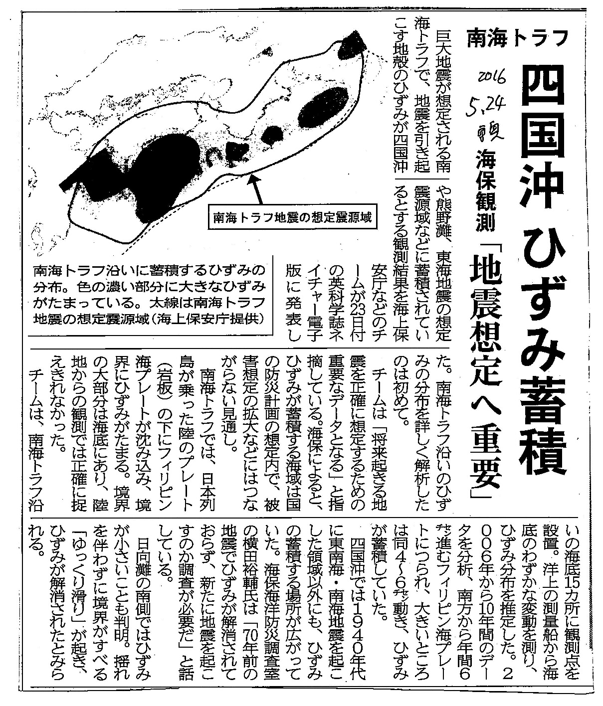 [2016_05_24_03]南海トラフ 四国沖 ひずみ蓄積 海保観測「地震想定へ重要」(東奥日報2016年5月24日)