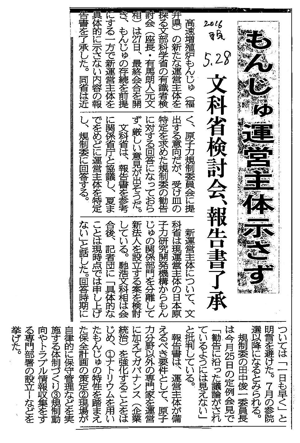 [2016_05_28_01]もんじゅ運営主体示さず 文科省検討会、報告書了承(東奥日報2016年5月28日)