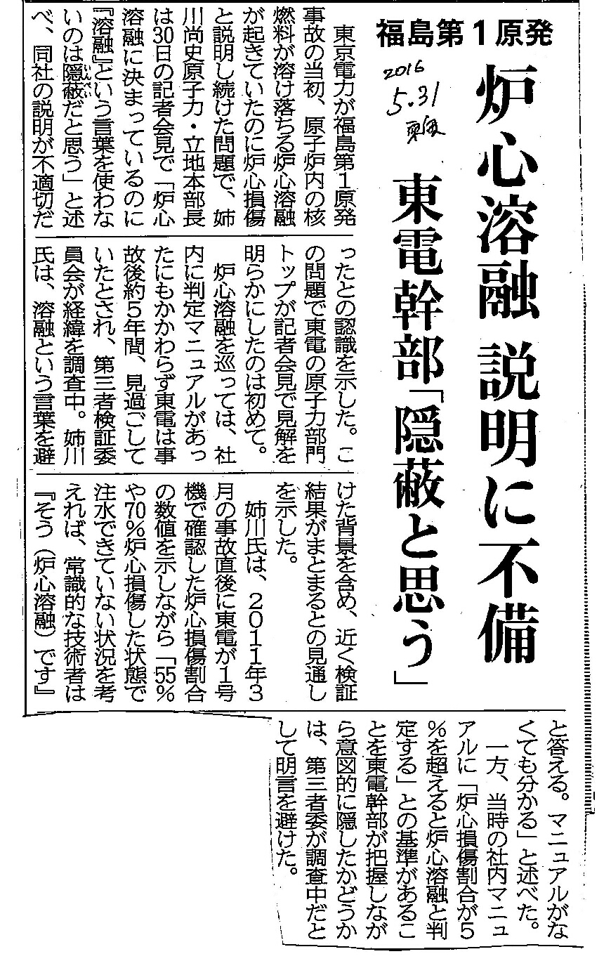 [2016_05_31_04]福島第一原発 炉心溶融 説明に不備 東電幹部「隠蔽と思う」(東奥日報2016年5月31日)