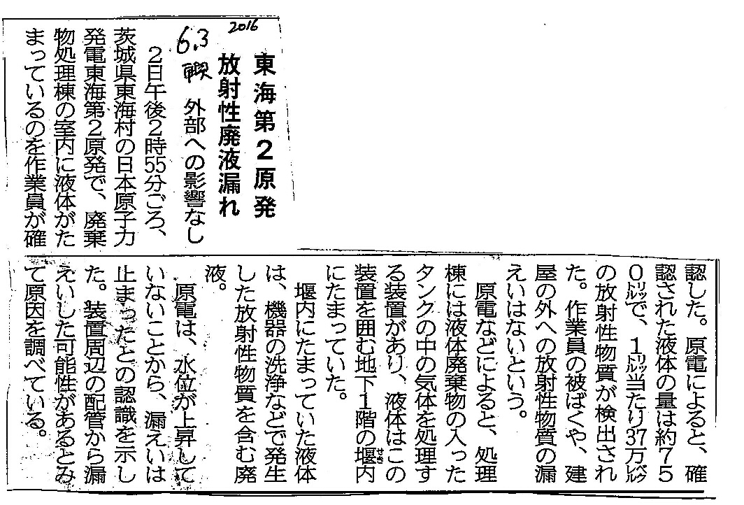 [2016_06_03_03]東海第2原発 放射性廃液漏れ 外部への影響なし(東奥日報2016年6月3日)