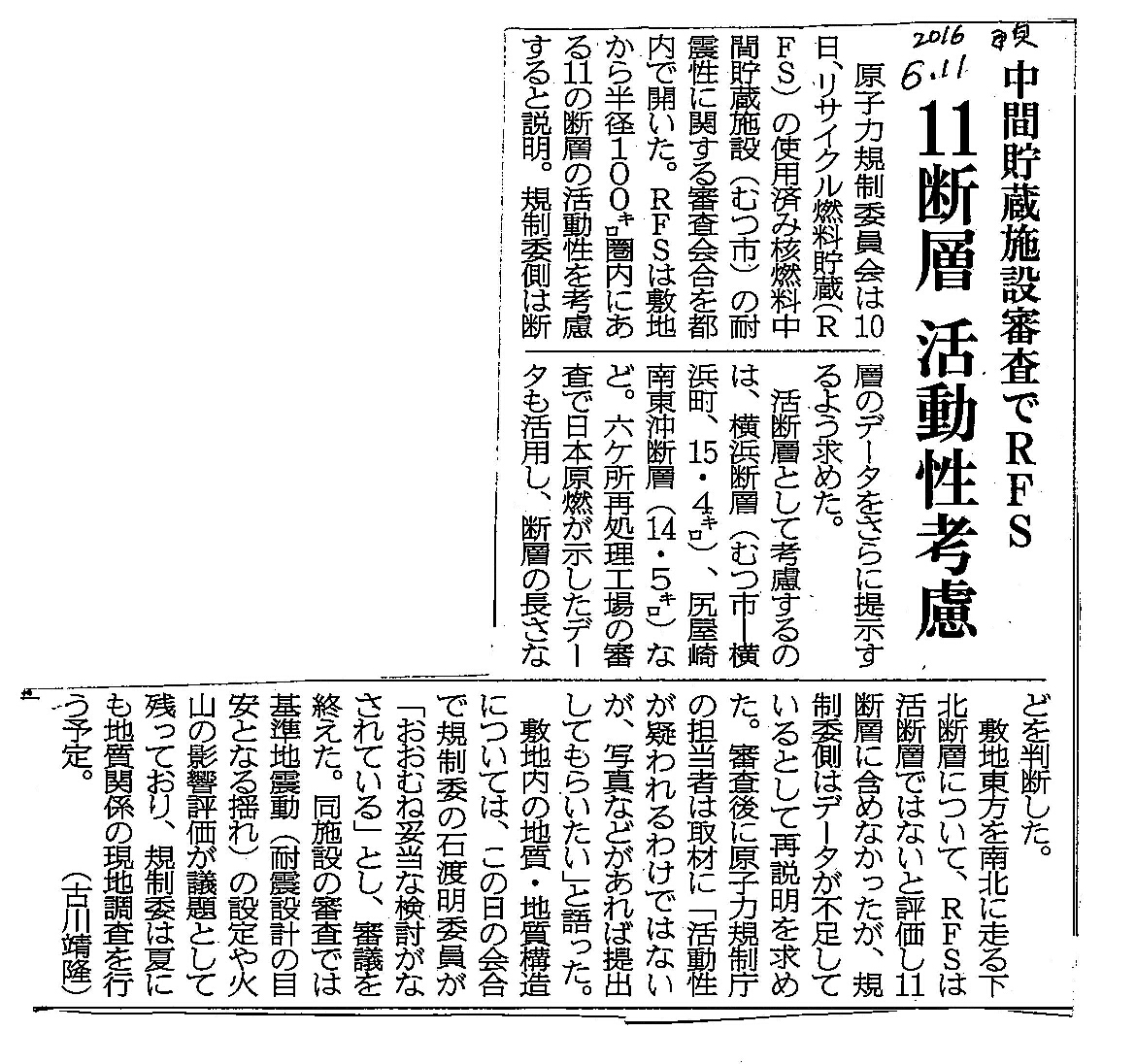 | [2016_06_11_03]中間貯蔵施設審査でRFS 11断層 活動性考慮(東奥日報2016年6月11日) |