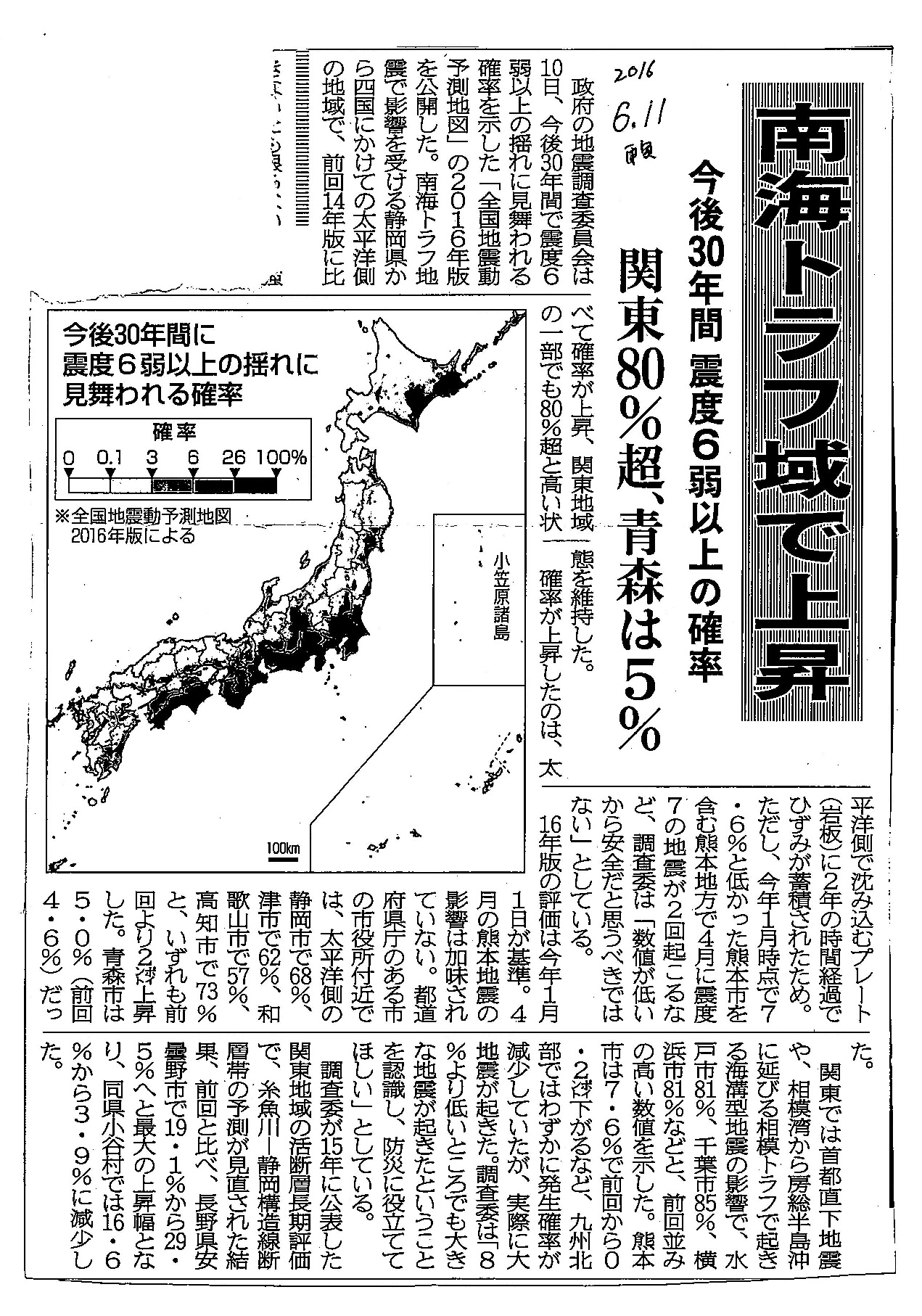 | [2016_06_11_04]南海トラフ域で上昇 今後30年間 震度6弱以上の確率 関東80%超、青森は5%(東奥日報2016年6月11日) |