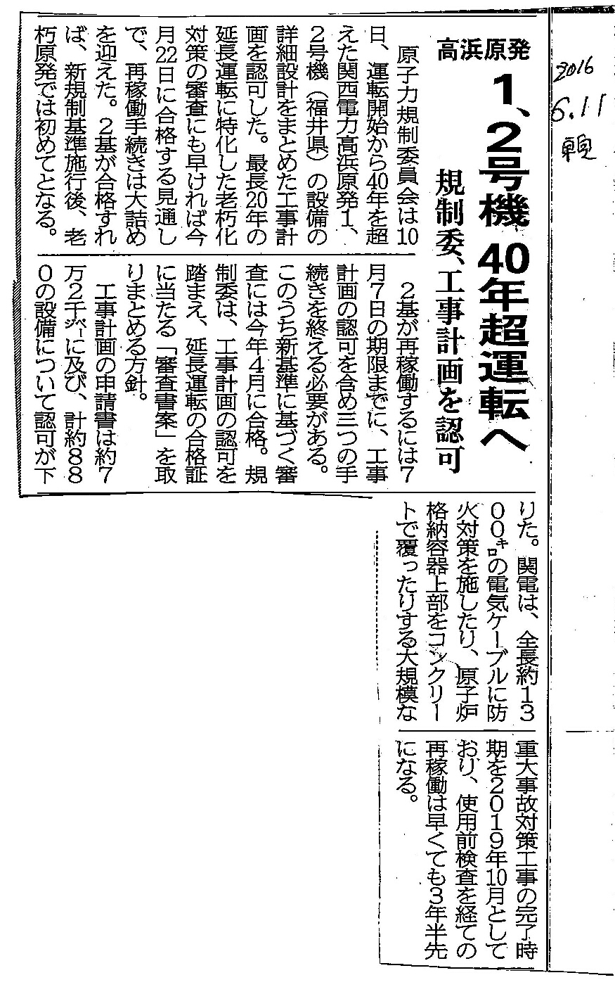 [2016_06_11_05]高浜原発 1,2号機 40年超運転へ 規制委、工事計画を認可(東奥日報2016年6月11日)