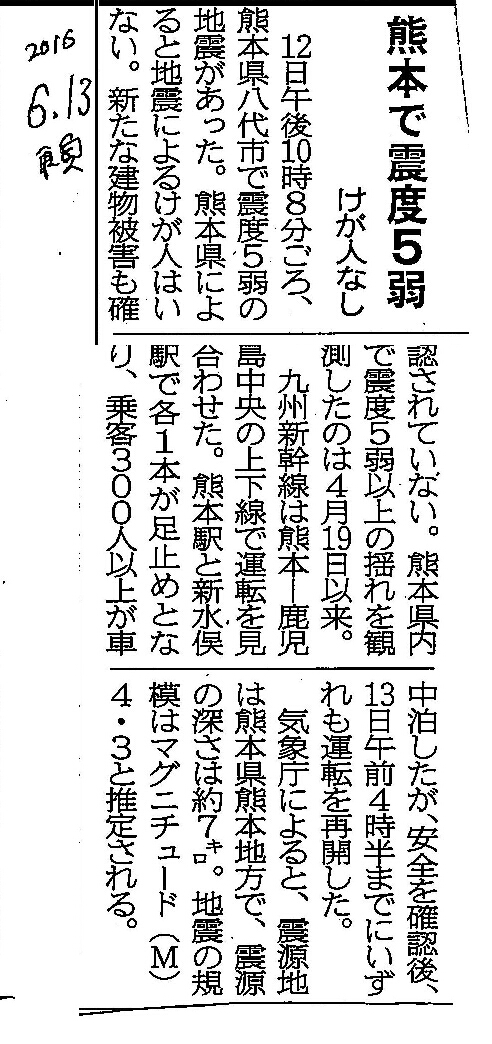 [2016_06_13_01]熊本で震度5弱 けが人なし(東奥日報2016年6月13日)