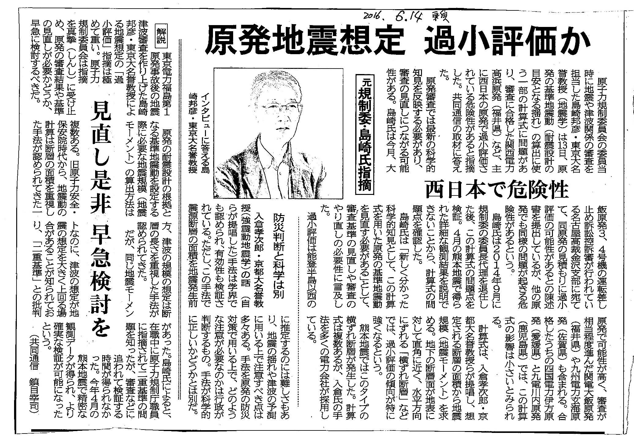 | [2016_06_14_02]原発地震想定 過小評価か 元規制委・島崎氏指摘 西日本で危険性 見直し是非 早急検討を 防災判断と科学は別 入倉孝次郎・京都大名誉教授(強振動地震学)の話(東奥日報2016年6月14日) |