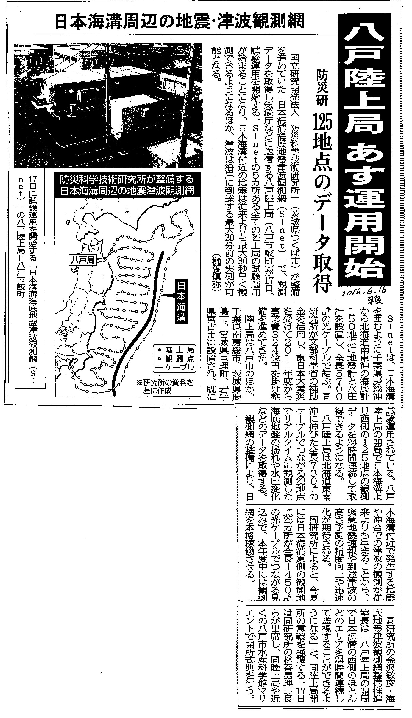 | [2016_06_16_01]日本海溝周辺の地震・津波観測網 八戸陸上局 あす運用開始 防災研 125地点のデータ取得(東奥日報2016年6月16日) |