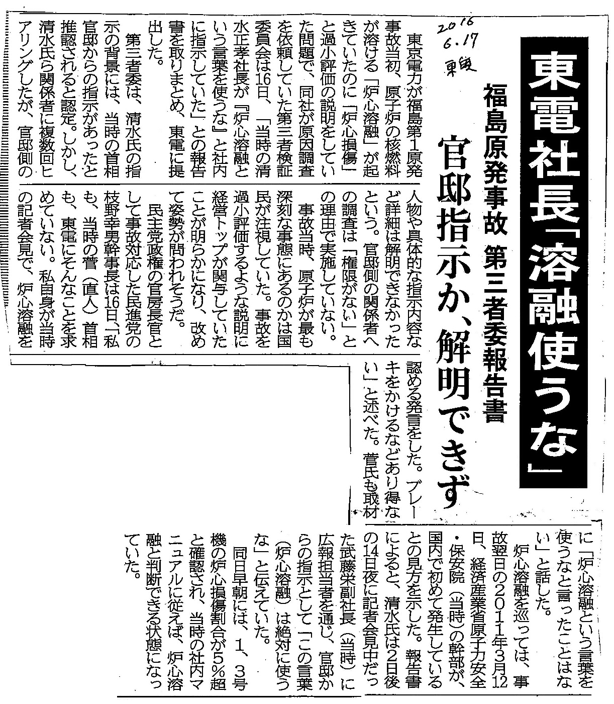 [2016_06_17_03]東電社長「溶融使うな」 福島原発事故 第三者委報告書 官邸指示か、解明できず(東奥日報2016年6月17日)