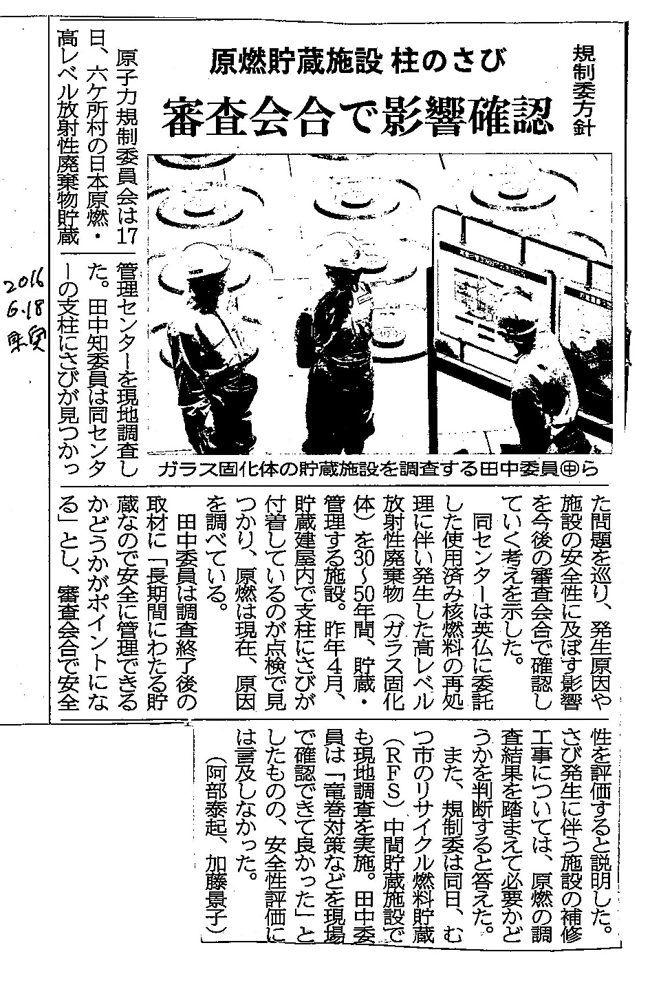 | [2016_06_18_01]規制委方針 原燃貯蔵施設 柱のさび 審査会合で影響確認(東奥日報2016年6月18日) |