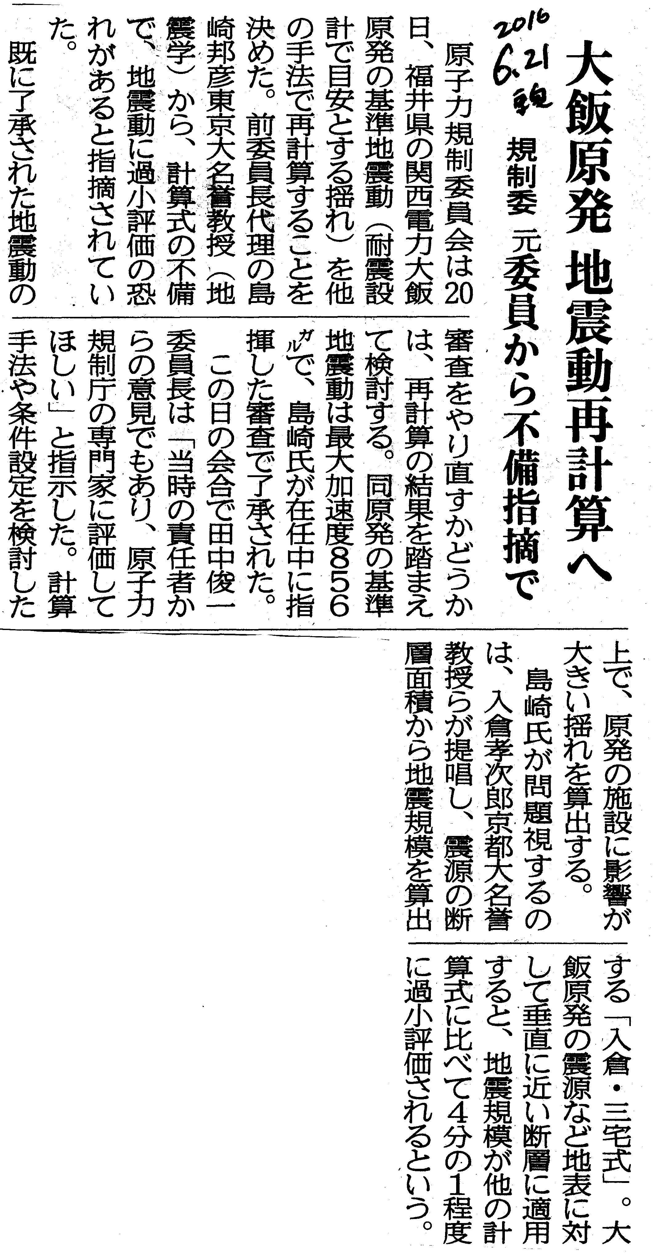 | [2016_06_21_04]大飯原発 地震動再計算へ 規制委 元委員から不備指摘で(東奥日報2016年6月21日) |