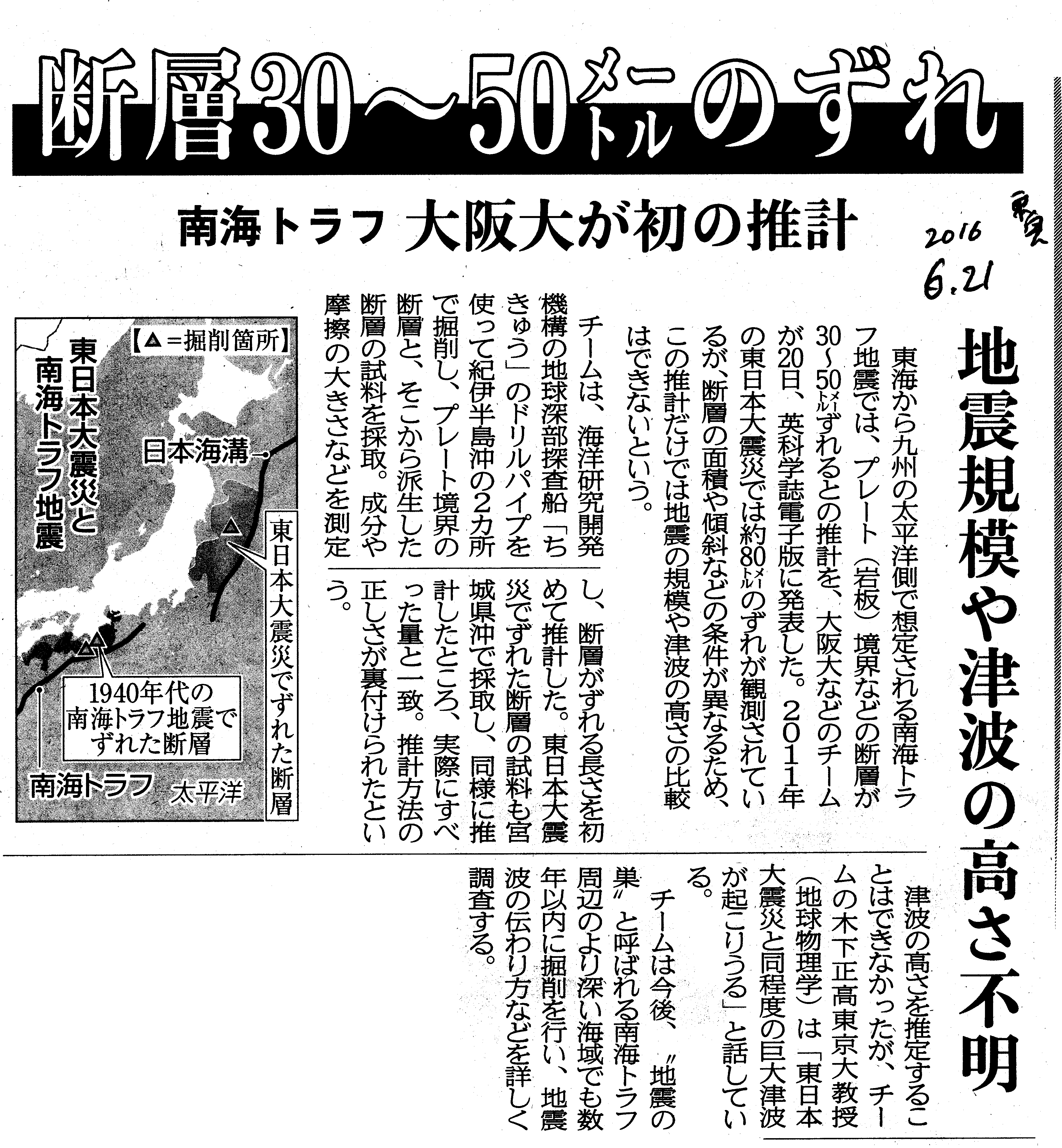 | [2016_06_21_05]断層30〜50メートルのずれ 南海トラフ 大阪大が初の推計 地震規模や津波の高さ不明(東奥日報2016年6月21日) |