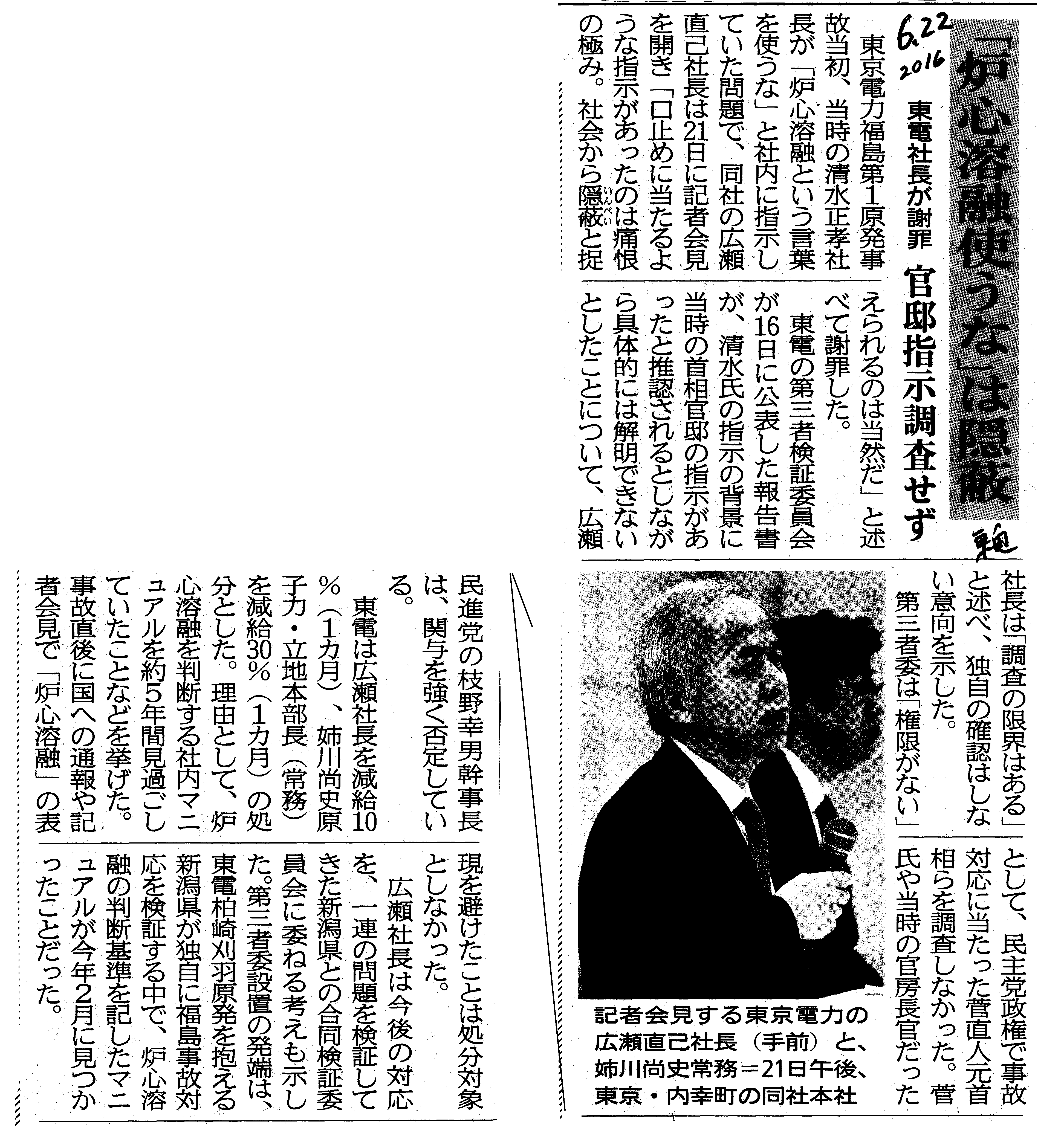 [2016_06_22_03]「炉心溶融使うな」は隠蔽 東電社長が謝罪 官邸指示調査せず(東奥日報2016年6月22日)