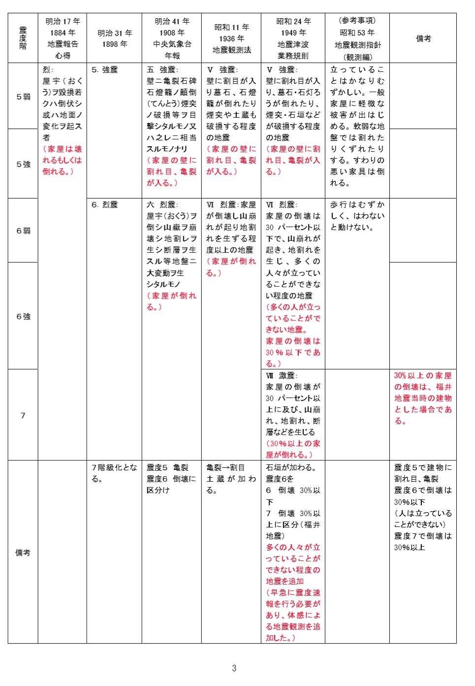 気象庁震度階の変遷と震度階級関連解説表の比較_気象庁震度階変遷表(1)_明治17年〜昭和24年まで(2/2)(4page目抜粋)