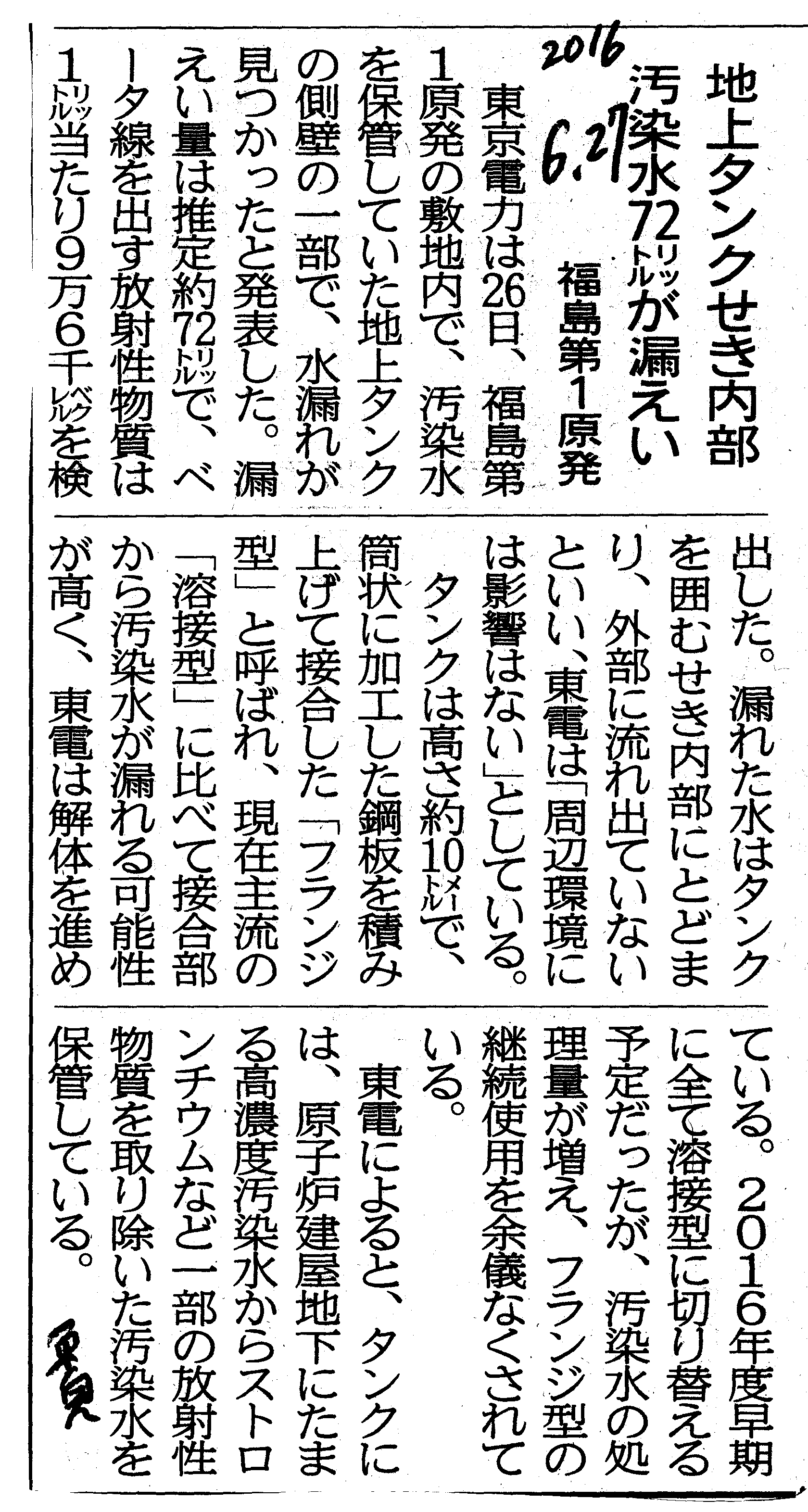| [2016_06_27_03]地上タンクせき内部 汚染水72リットルが漏えい 福島第1原発(東奥日報2016年6月27日) |