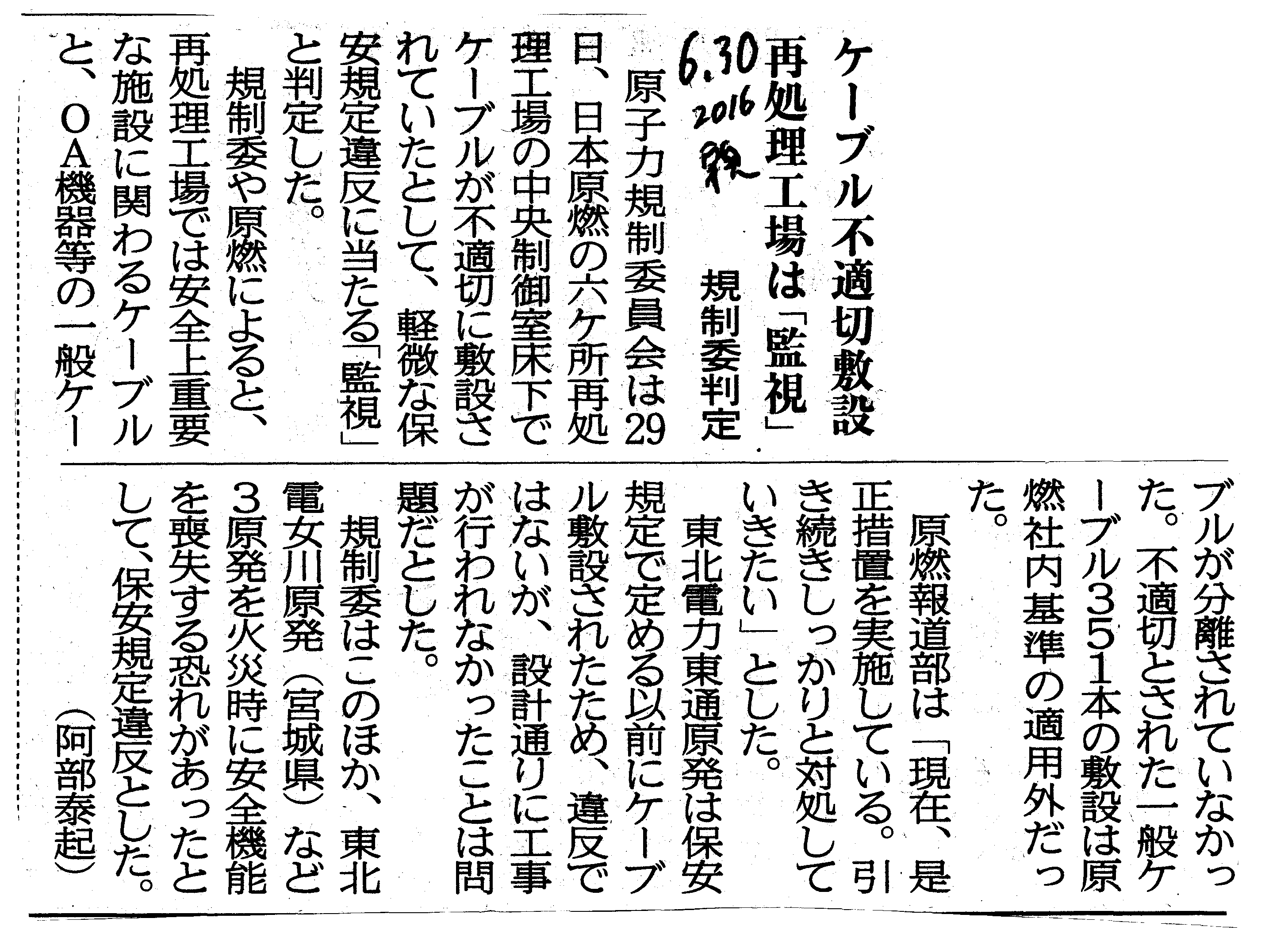 | [2016_06_30_02]ケーブル不適切敷設 再処理工場は「監視」 規制委判定(東奥日報2016年6月30日) |