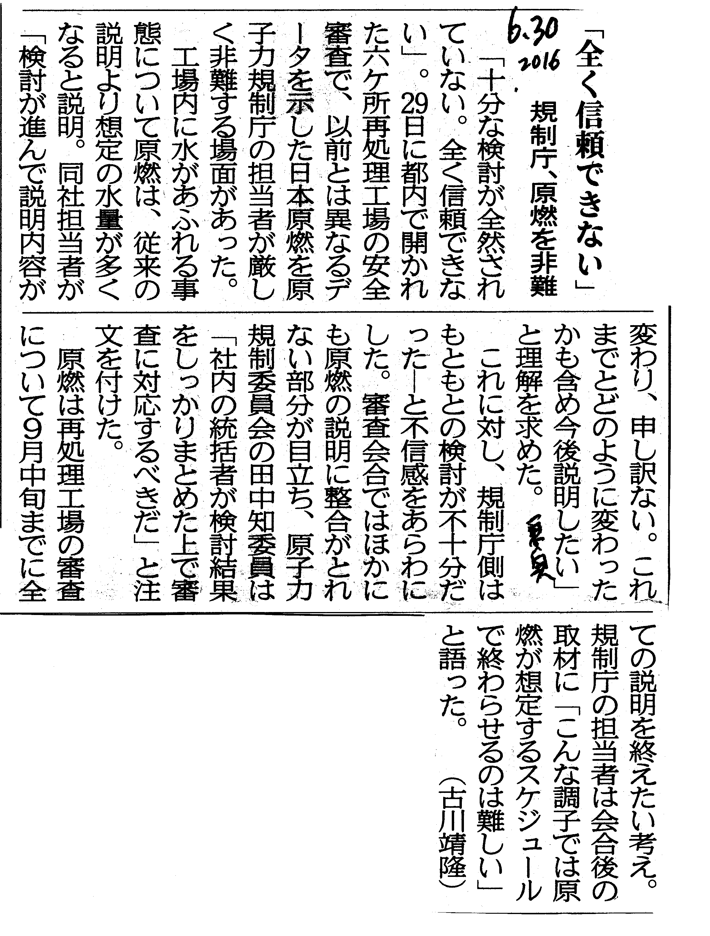 | [2016_06_30_03]「全く信頼できない」 規制庁、原燃を非難(東奥日報2016年6月30日) |