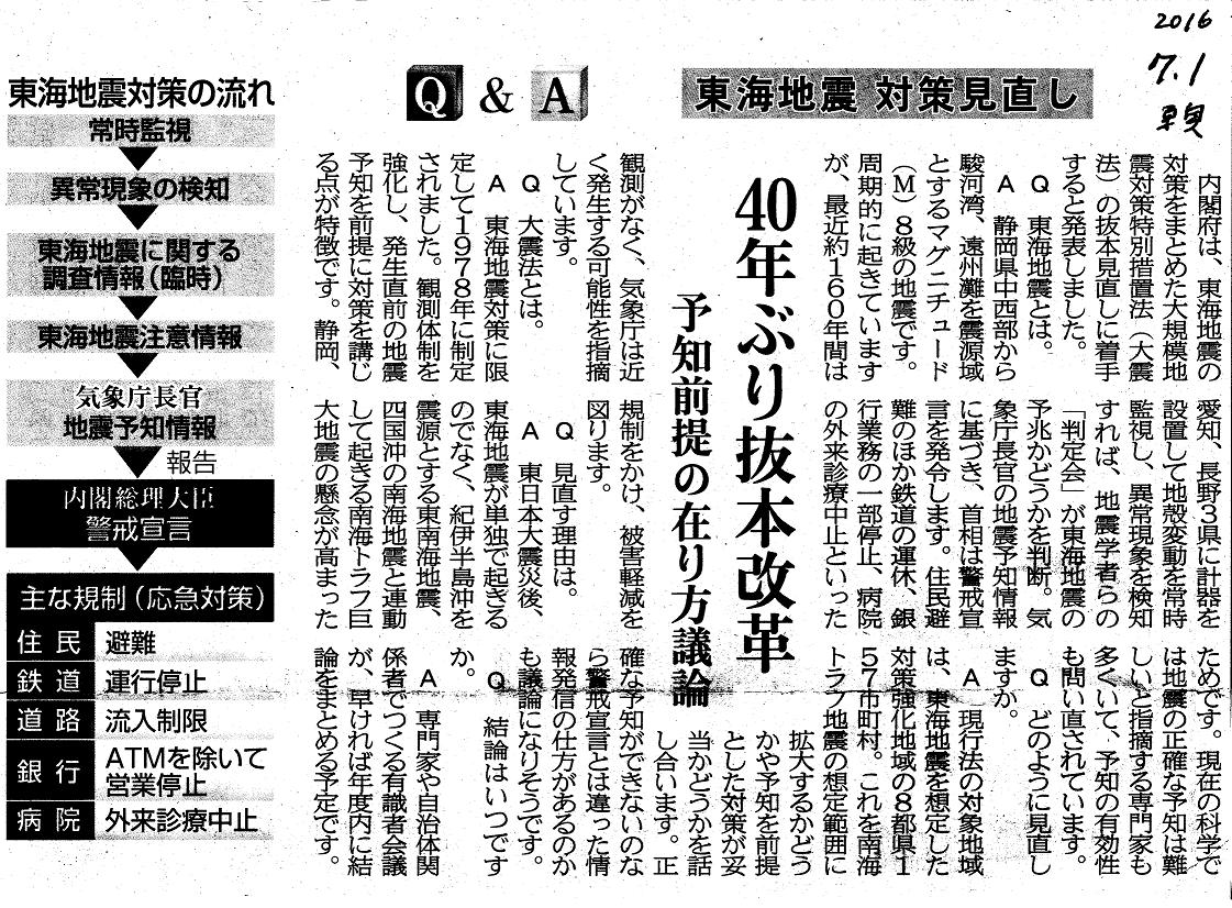 [2016_07_01_03]Q&A 東海地震 対策見直し 40年ぶり抜本改革 予知前提の在り方議論(東奥日報2016年7月1日)
