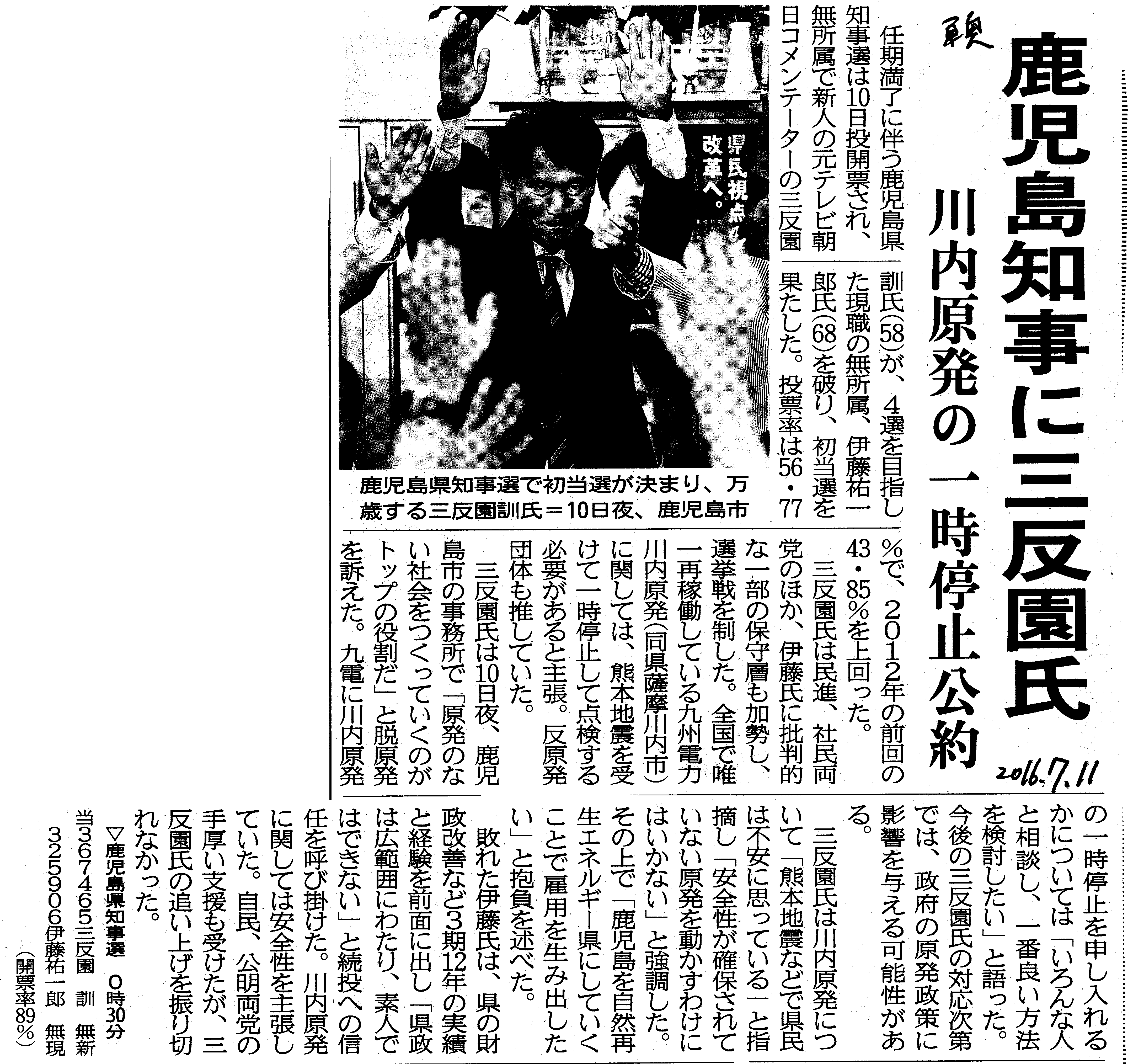 [2016_07_11_01]鹿児島県知事に三反園氏 川内原発の一時停止公約(東奥日報2016年7月11日)
