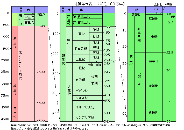 参照元 ※引用者注:以下はICS(国際層序委員会)の2010年の勧告 前の地質年代表である。 下に理科年表2005(CD-ROM版、丸善)の地質年代表を挙げておく。日本ではよく使われている地質年代表である。地質年代区分の絶対年代が上に出した図とかなり異なることに注意。こうした区切りとなる年代は、研究が進むにつれて改訂される。 ※ 2011年度用の高校地学Iの教科書では、上のICS(国際層序委員会)の2010年の勧告に準拠した地質年代区分が使われている。 また下のように、かつては新生代をおおきく第三紀(Tertiary Period)、第四紀(Quaternary Period)にわけ、その第三紀を古第三紀(Pal〔a〕eogene Period)、新第三紀に(Neogene Period)わけることがふつうだった。しかし、国際層序委員会(ICS)は第三紀、第四紀という区分を無くした(2004年、第三紀をなくすことは決定)。しかし、この案に対して、とくに第四紀研究者を中心に強い反対意見が出たため、新しい区分として代−紀の中間の“亜代(sub-era)”をつくり、第三亜代−第四亜代として、その境界を259万年前(鮮新世の終わりころ)とした(2005年)。これに対しても、亜代という区分を新たに作ることは、地質年代区分の整合性をなくすという意見も強く、第四紀を“紀”として存続させることになった。下の地質年代表では第三紀/第四紀の境界は165万年前(最近は180万年前)となっているが、国際層序委員会は第三紀末の鮮新世の一部を更新世に繰り入れて、第三紀/第四紀の境界を260万年前とする提案をしている。上の顕生代の地質年代表はとりあえずそれに従っている。 ![]() |