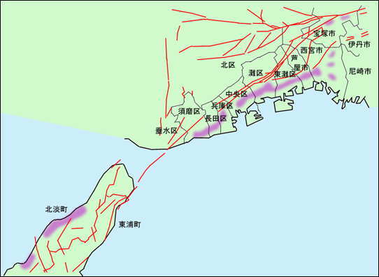 兵庫県南部地震データ集>3.兵庫県南部地震で地下で起こったこと>震災の帯の不思議(震度7地域の分布)