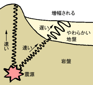 参照元 ![]() 図9は神戸周辺の活断層の分布と震度7地域の広がりです。もっとも激しい被害を受けた地域は、活動したと推定される断層にそって広がっていることに注目しましょう。一方で、断層の真上で一番被害が大きいわけではなかったことも注目されました。地下の地盤のようすが地震による被害に大きな影響をおよぼします。固い地盤からやわらかい地盤にゆれが伝わるとき、ゆれが増幅されることがあります(図10)。 ![]() |