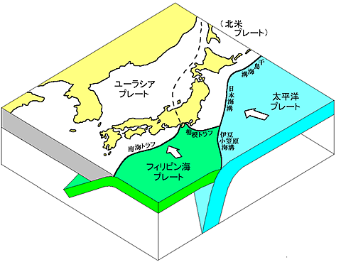 参照元 ![]() ここで日本周辺に目を向けると,日本列島をめぐるプレートの状況は 図4.9に示すようになっています. 北日本の東方には,ハワイ諸島をのせた厚さ70〜100kmの太平洋プレートがあって, 西北西に年間約8cmの速度で進んでいます. 太平洋プレートは,北海道沖合いの千島海溝,三陸・房総沖合いの日本海溝, そして伊豆諸島東方の伊豆・小笠原海溝を結ぶ位置から日本列島下に沈み込んでいます. 一方,西日本の南方には,厚さ30〜40kmのフィリピン海プレートがあって,北西方向に年間約4cmの速度で進んでいます. フィリピン海プレートは,房総半島南方から相模湾にかけての相模トラフ, 駿河湾から遠州灘にかけての駿河トラフ,東海・紀伊半島・四国沖合いの南海トラフ, そして南西諸島に沿う南西諸島海溝へと続く位置から,日本列島の下へと沈み込んでいます. (後略) |