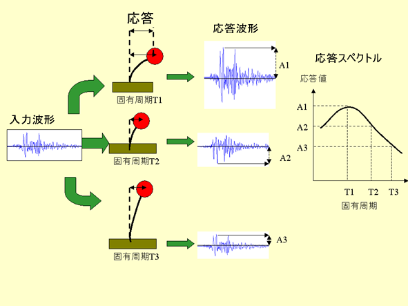 各種データ・資料>地震の活動状況>強震観測>用語の解説>フーリエスペクトルと加速度応答スペクトル 地震波にはさまざまな周期の波が含まれています。地震波をさまざまな周期の振動の集まりととらえ、周期ごとの地震波の強さに分解し表したものをフーリエスペクトルと言います。図1は2003年宮城県沖の地震のときの大船渡と2003年十勝沖地震の浦河のフーリエスペクトルです。大船渡は浦河に比べて周期の短い地震波が卓越していることがわかります。大船渡は周期が約0.5秒以下の地震波の振幅が大きいですが、周期が1秒以上の地震波は浦河の方が大きくなっています。しかし地震波が構造物におよぼす影響を地震波のフーリエスペクトルから読み取ることは困難です。地震波によって構造物がどのように振る舞うかを知る方法として応答スペクトルがあります。 応答スペクトルは構造物がさまざまな固有周期、減衰定数を持つ1質点・1自由度系*と考えたとき、構造物がある地震波にさらされたときの最大応答値をスペクトルで表したものです(図2)。応答値が加速度の場合、加速度応答と言います 図3はおもな地震のおもな観測点の加速度応答スペクトルを示したものです。 加速度の場合は0.5〜2秒付近に主要な変動がよく現れますが、短周期をよく見えるように時間軸を対数表記しています。 加速度に質量をかけたものが力ですから、2003年の宮城県沖の地震のときには、固有周期が0.3秒程度の構造物は大きい力を受けますが、固有周期が0.5秒以上の構造物は大きな力を受けなかったのに対し、兵庫県南部地震の固有周期0.5秒〜1秒の構造物に大きな力を受けることがわかります。 * 質点が1つだけで、その質点の運動を記述するために必要な座標軸が1つだけの系のこと。 ![]() |